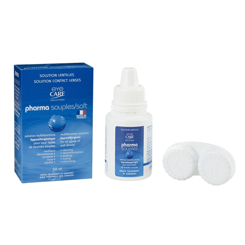 Pharmasouples all-in-one solution is a hypoallergenic cleanser for soft contact lenses and silicon hydrogel lenses.
